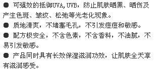 壹款無油份防曬霜。能有效抵御UVA/UVB而不會阻塞毛孔;質地貼薄,令皮膚無油膩感,不易脫妝。不含油脂,香料及胺基苯甲酸。
