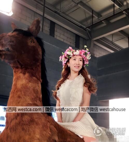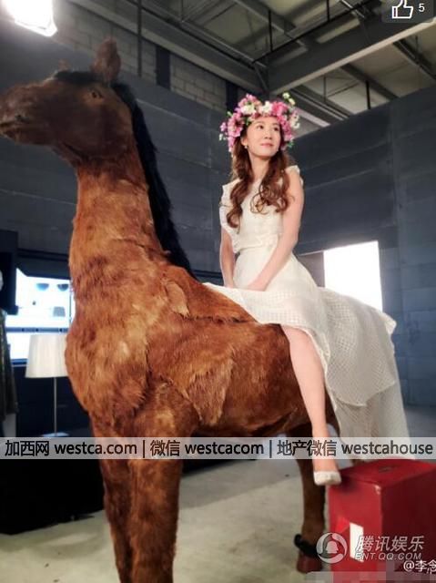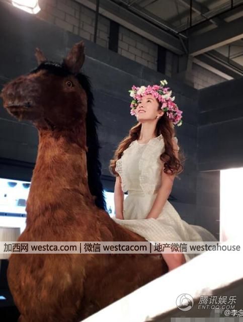 李念一副花仙子的打扮,骑在道具马上拍戏。