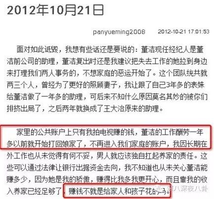 雖然婚姻裡沒有對錯,但離婚時,董潔還是屬於婚內出軌啊。感覺潘粵明對董潔應該是非常有感情的,比如結婚3年時,兩人都發了微博,但話風完全不壹樣,壹個說要癢壹癢,壹個說正幸福中。