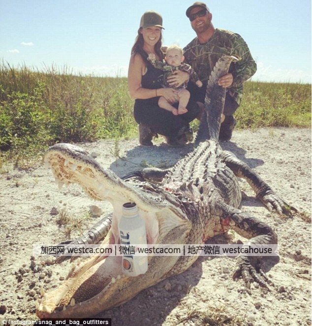 圖為女獵人香農?莎莉文懷抱自己6個月大的兒子與丈夫並排蹲坐在壹條大短吻鱷身後,短吻鱷的嘴巴被他們用水瓶支開。照片裡,莎莉文和丈夫笑的很開心。