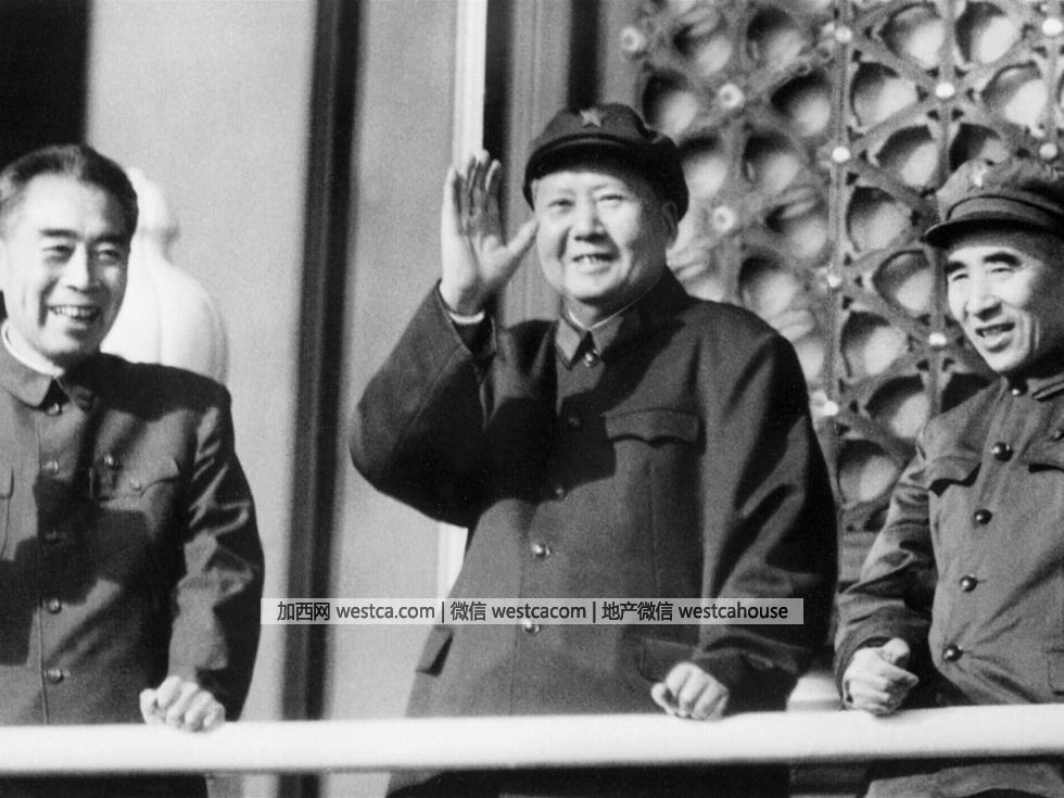 1967年10月,毛泽东接见红卫兵。周恩来(左一)、毛泽东(左二)、林彪(左三)(图源:AFP/VCG)