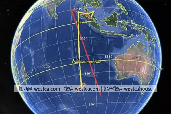 這是機長平時的演練路線與專家推測的現實路線對比。紅色為機長的練習路線,黃色是此前推測的MH370失聯後的飛行路線。橙色方塊是搜索客機殘骸的區域。