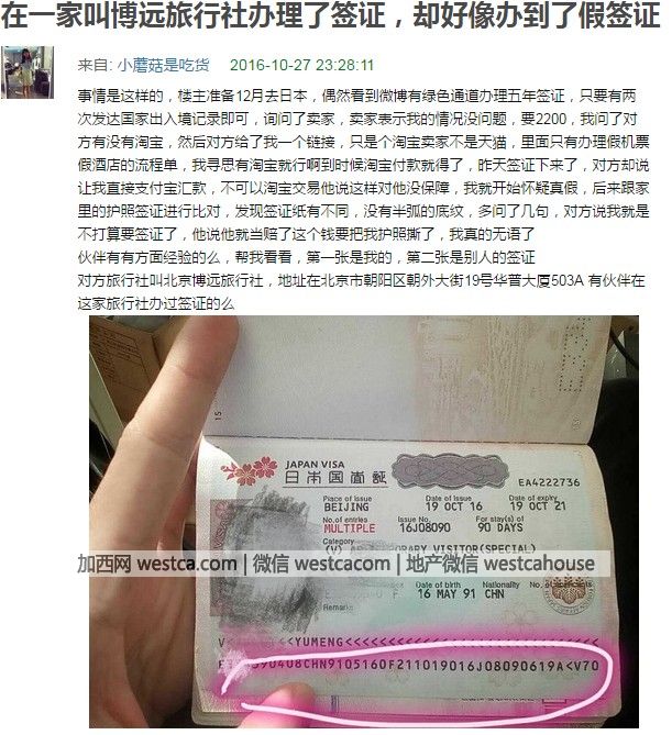 去年10月就有網友在網上稱疑似代辦了壹個假簽證。