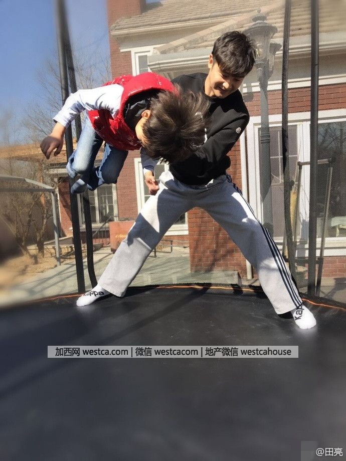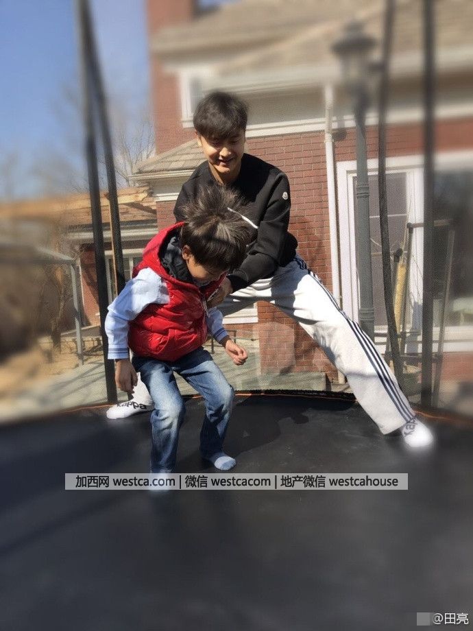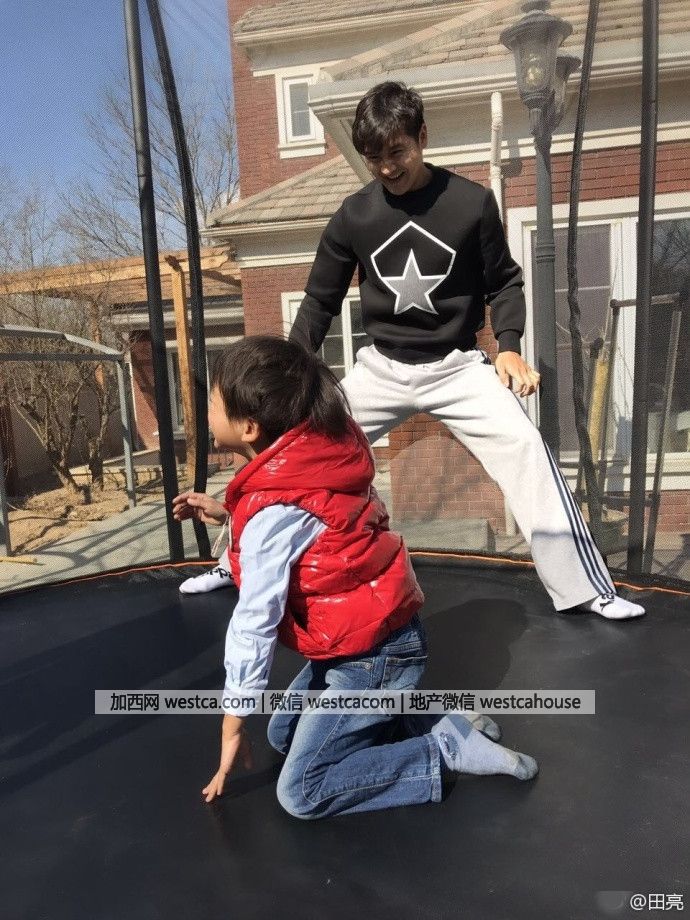 3月6日,田亮在微博曬出帶兒子在家門口玩蹦床的照片,小亮仔空翻超厲害。