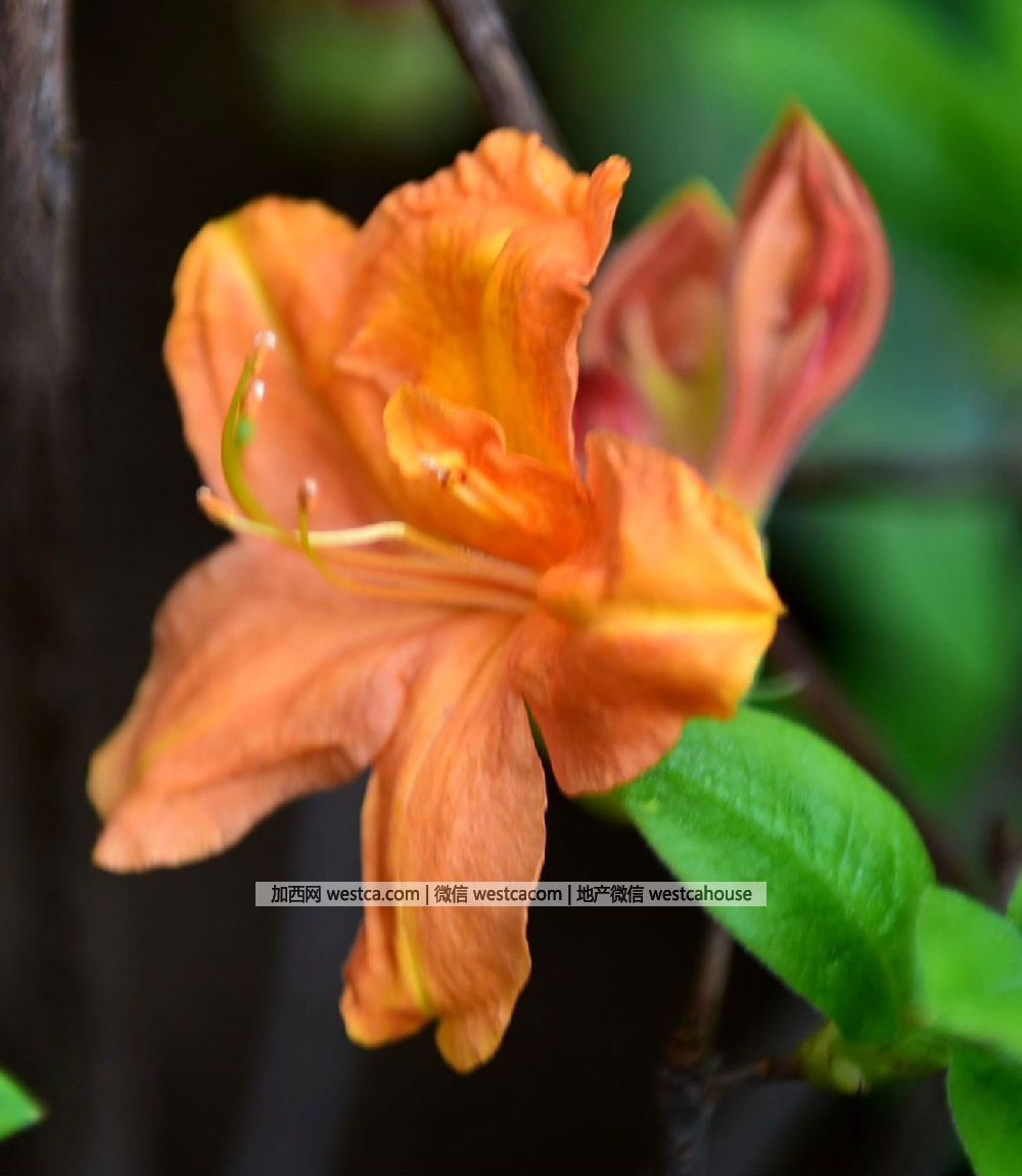 ‘金鷹’杜鵑(Rhododendron'Golden Eagle'):低地落葉型杜鵑,花朵橙黃色,亮麗,最上面壹枚花瓣與其余4枚相同,無斑點。