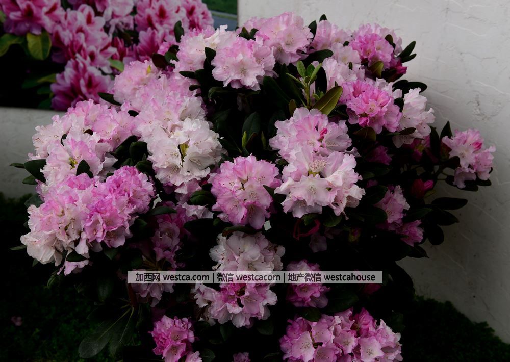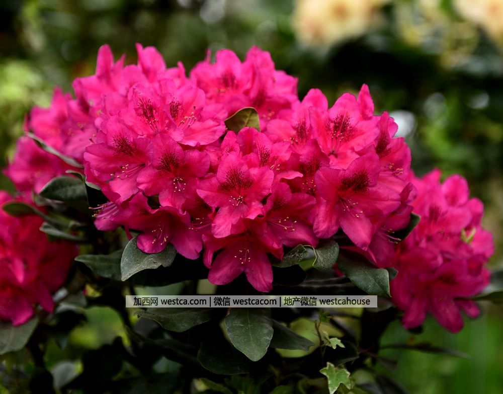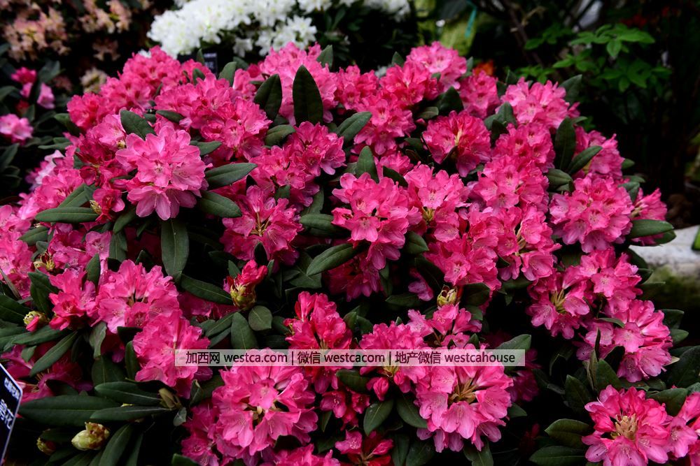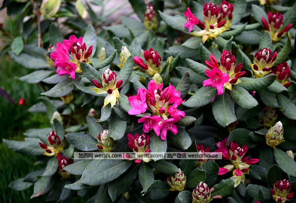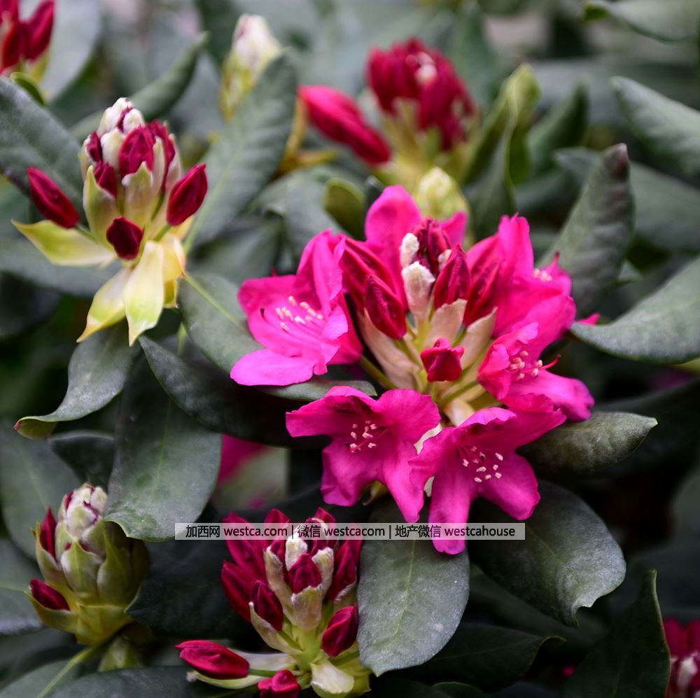 江南地區城鄉綠地栽培最普遍的毛鵑高山杜鵑壹般指無鱗杜鵑花亞屬、有鱗杜鵑花亞屬和馬銀花亞屬中的常綠杜鵑,尤其是由該叁亞屬的杜鵑經過長期雜交培育的栽培品種。高山杜鵑花頂生,總狀傘型花序巨大,壹般花序達到15-20cm,有的品種甚至可達30cm,花冠鍾狀,花色豐富多樣,色澤鮮艷優美;植株豐滿,葉簇生枝頂,葉大,葉面無毛,葉背被赤黃色密綿毛。