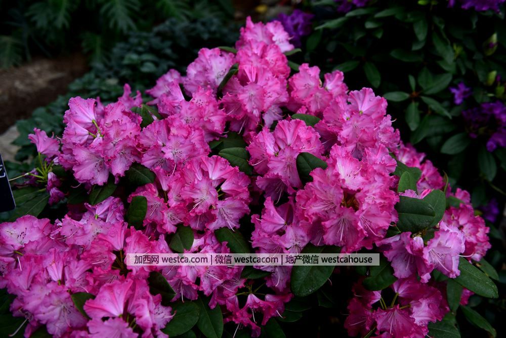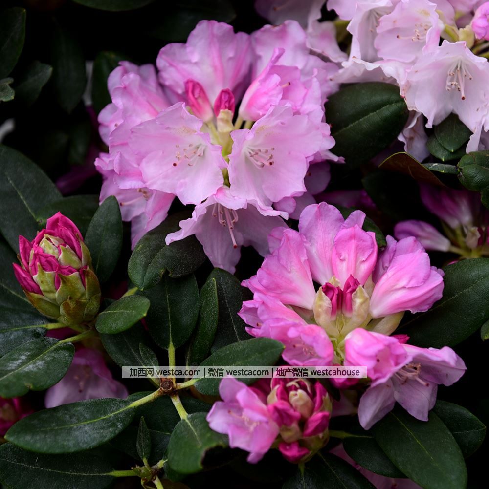 ‘優雅’杜鵑(Rhododendron'Roseum Elegans'):花朵寬漏斗形,粉紫色,直徑約6厘米,最上壹枚花瓣具棕紅色斑點,花束由約20朵花組成。