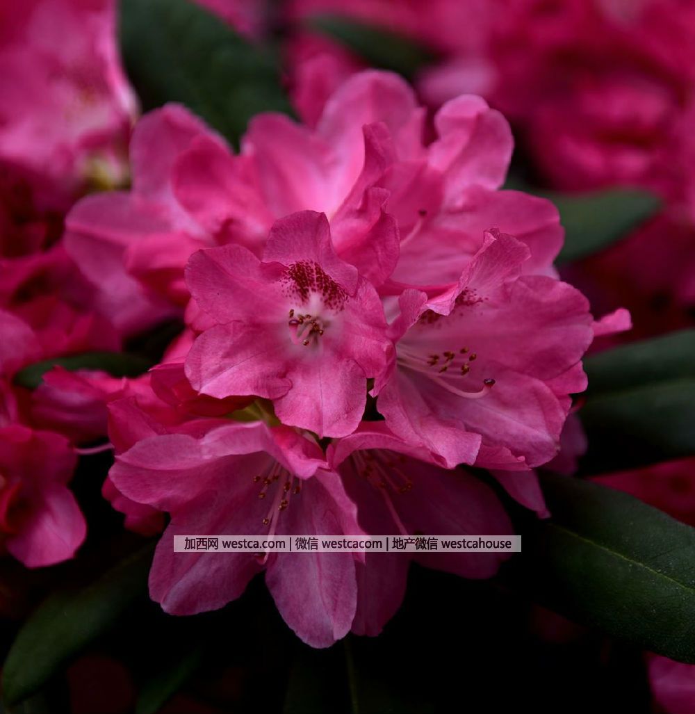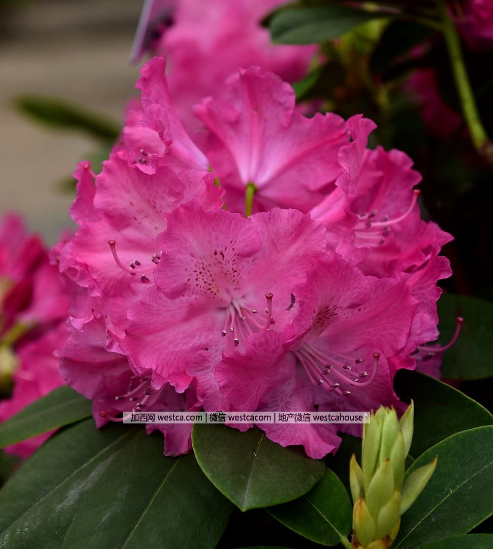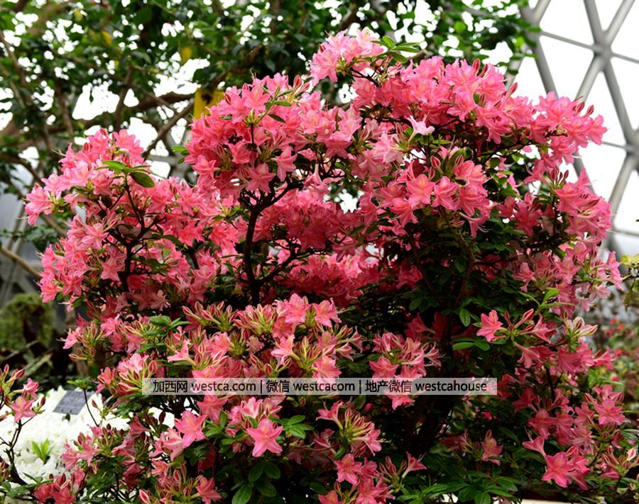 ‘詩尼姿’杜鵑(Rhododendron'Sneezy'):花朵亮粉紅色,中心顏色稍淺,花束由約16余朵花組成,最上面壹枚花瓣具深紅色。