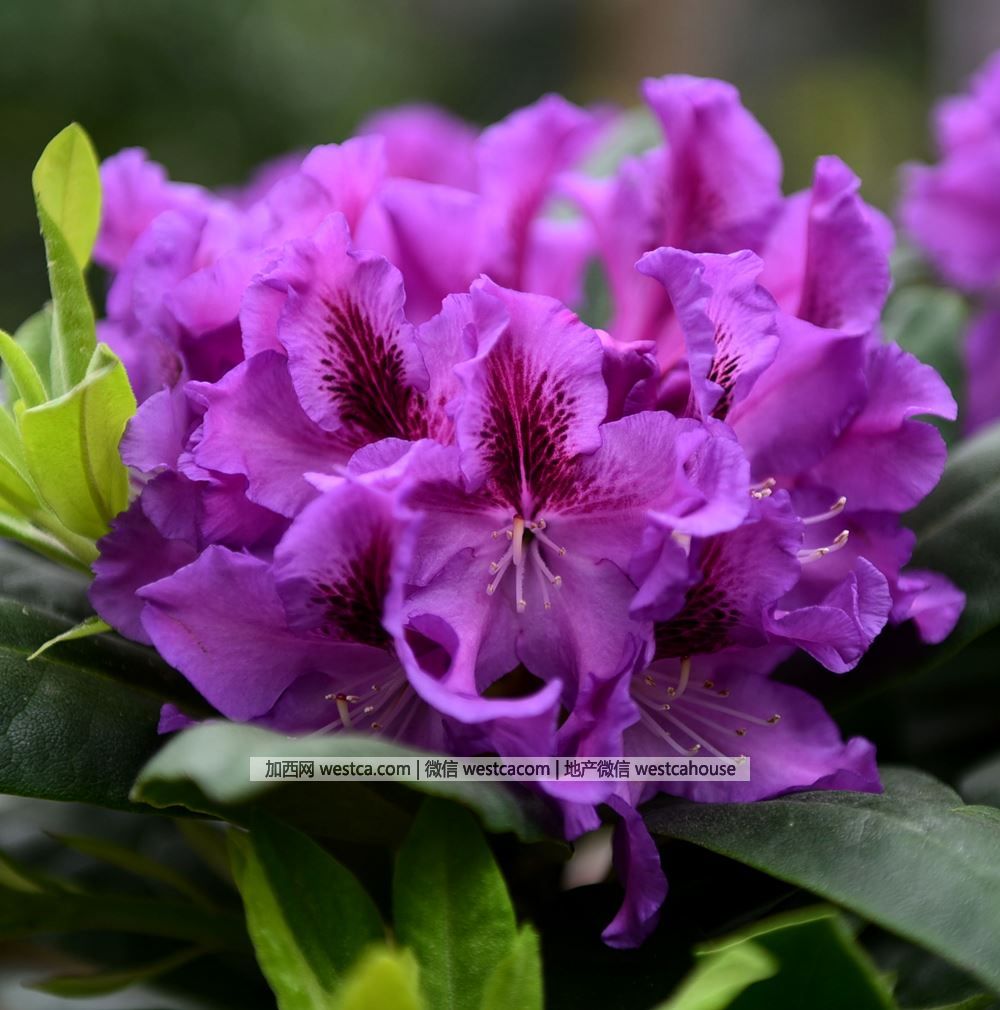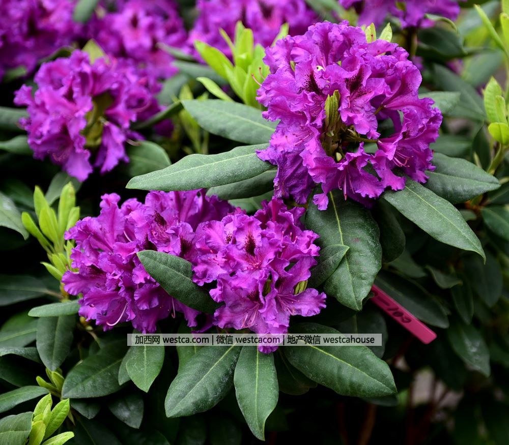 ‘阿朱’杜鵑(Rhododendron'Azurro'):花朵深紫色,華麗典雅,最上面壹枚花瓣具深紫紅色斑點,5枚花瓣邊緣略呈波浪狀,花束由11-14朵花組成。