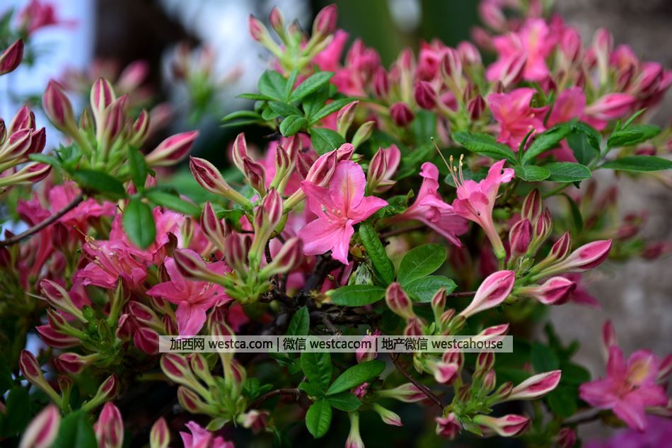 ‘朱莉’杜鵑(Rhododendron'Golden Eagle'):花呈管狀漏斗形,直徑約5-6cm,花朵粉紅色,最上壹枚花瓣具橙黃至淡黃色斑點,7-9朵組成壹束。