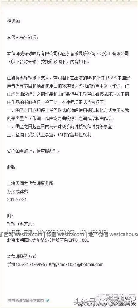 12年曲婉婷加盟環球唱片,直接給李代沫發了封律師函,不允許再唱《我的歌聲裡》,之前唱過的記得給錢