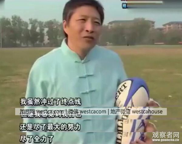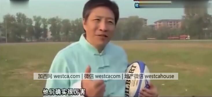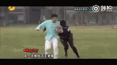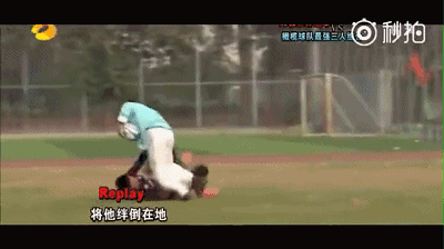 字幕解說稱:王老師轉身將(橄欖球運動員)摔倒在地: