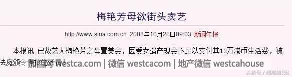 2009年及2011年,梅艷芳的遺產管理人出售阿梅位於倫敦的物業及拍賣梅艷芳43件珠寶,分別套現500多萬港幣及681萬港幣,以支付梅媽生活費及訴訟費。2012年,梅母欠下了230萬港元的律師費。官司還壹直輸,氣得病倒。躺在病床上的梅母還在說,梅艷芳不是壹出生就會賺錢,不管多辛苦我都在支持她。