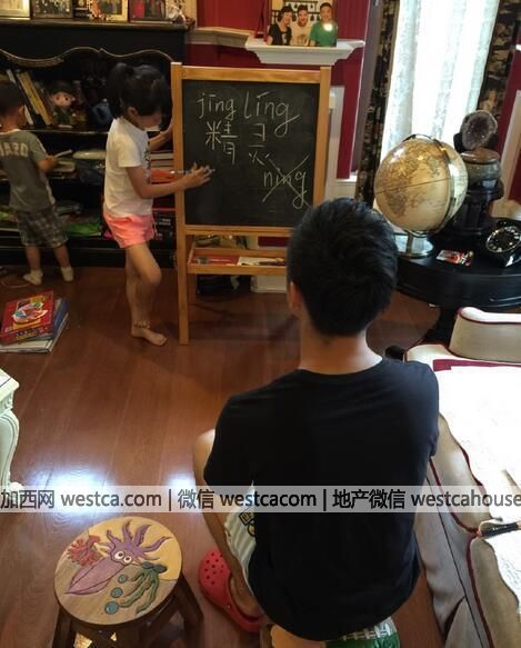 這間房看樣子是書房了,整個房間比較復古,矮櫃裡堆滿了書,這個高度剛好適合孩子隨意取書來看,還不會被高處的書砸到,天兩夫妻真的很細心。中間的小黑板是很好的教學工具,田亮家庭小課堂開課啦