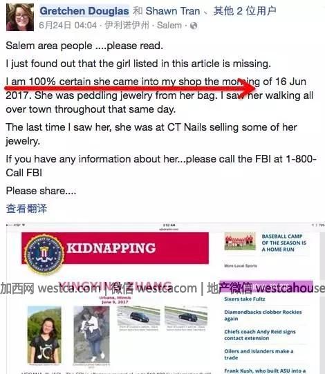 “這則尋人啟事上的女孩,我百分之百確定見過,2017年6月16日(瑩穎失蹤的第8天),她走進我的店裡,兜售背包裡的珠寶,同時,我在市裡的其他地方也看到她在賣珠寶。最後壹次見到她,是在CT美甲店。如果大家也曾看過她,請聯系FBI。”