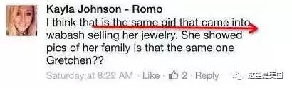 “我似乎也在Wabash見到這個女孩,跟你描述壹樣,也在賣珠寶,同時,她也向我們展示了她家人的照片。”