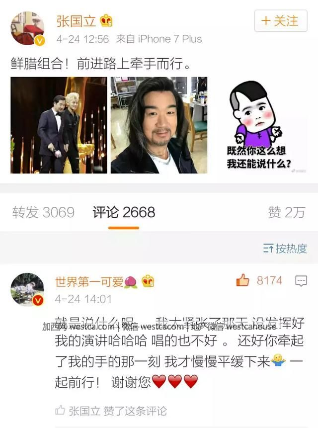 先上個最輕描淡寫的,張國立老師與黃子韜走紅毯之後發出合照,並點贊黃子韜的留言微博。