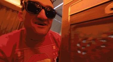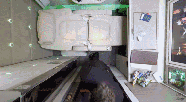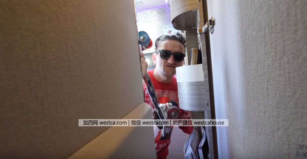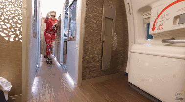 他在包廂裡發現了很多不同的櫃子,例如這個是壹個小衣櫃,設計是讓乘客放高級西裝什麼的。不過小哥沒有西裝,於是把自己的滑板放了進去...