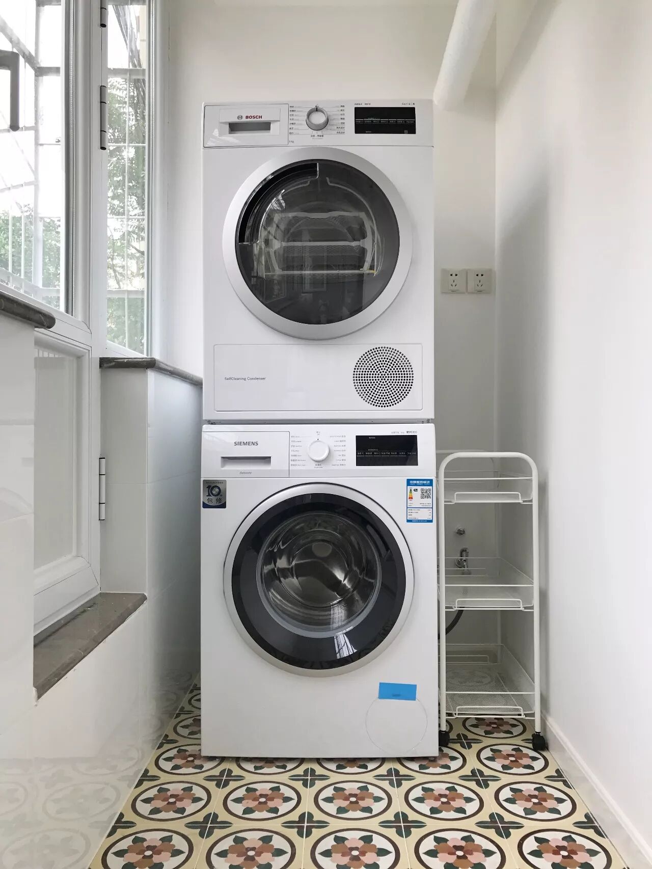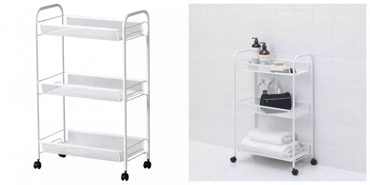 便宜又好看的小推車2號,尺寸剛好能塞在我們家洗衣機旁邊。圖片是入住前拍的,現在已經擺滿啦——上層是洗衣液、柔順劑等高瓶子,中層放洗衣保護袋、防染色布等洗衣時要用的,下層暫時收納著戴森的刷頭。