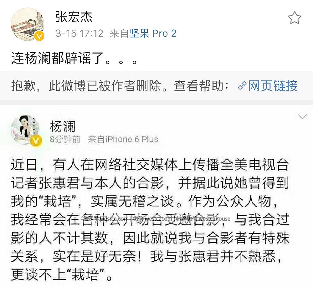 對此,楊瀾在微博專門發文,聲稱與張慧君素不相識,隨後刪貼。將近叁年沒有更新微博的吳征也隨後跟貼,撇清與張慧君的關系。楊瀾日前在新浪微博發帖,聲稱與全美電視台張慧君素不相識,隨後刪貼。