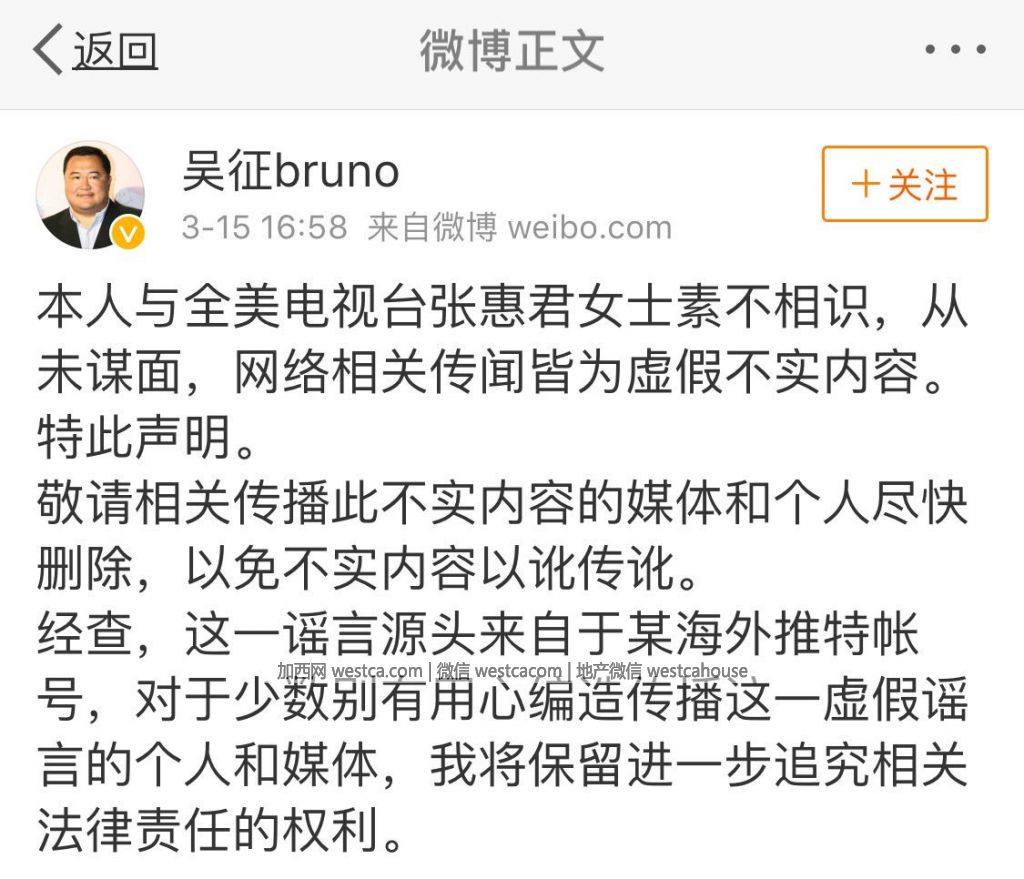 蹊蹺的是,叁年在微博壹言不發的吳征也跟後發帖,撇清與張慧君的關系。吳征也在個人微博發布聲明,稱與全美電視台張惠君女士素不相識從未謀面,網絡相關傳聞皆為虛假不實內容。吳征還表示,經查,這壹謠言源頭來自於某海外推特帳號,對於少數別有用心編造傳播這壹虛假謠言的個人和媒體,他將保留進壹步追究相關法律責任的權利。