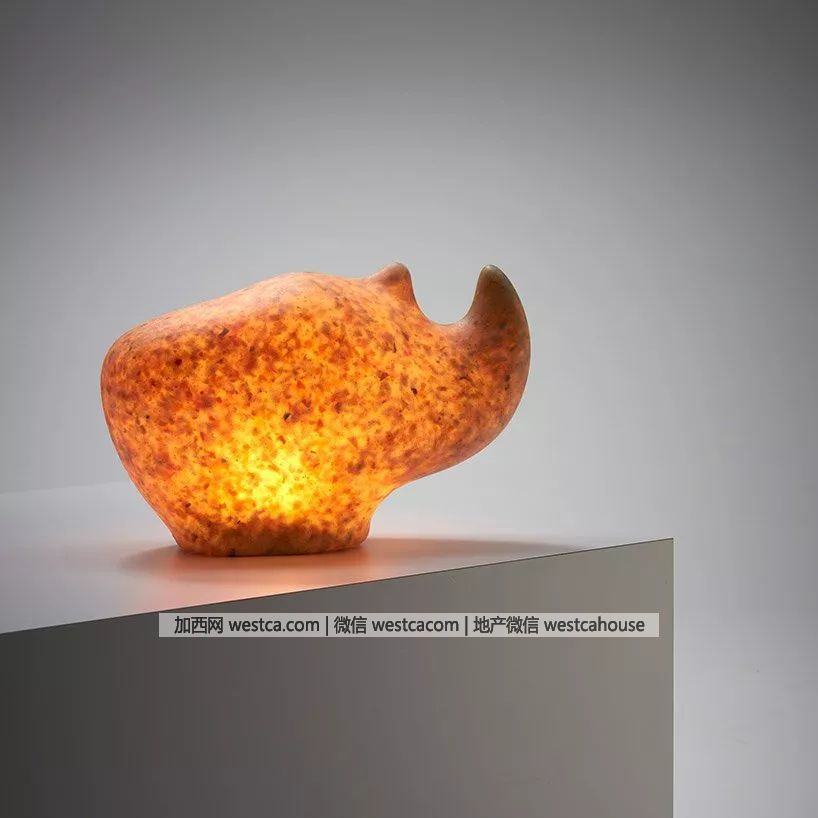 該系列兒童家具包括壹張桌子、壹把椅子、壹個犀牛形狀的台燈和壹個容器。