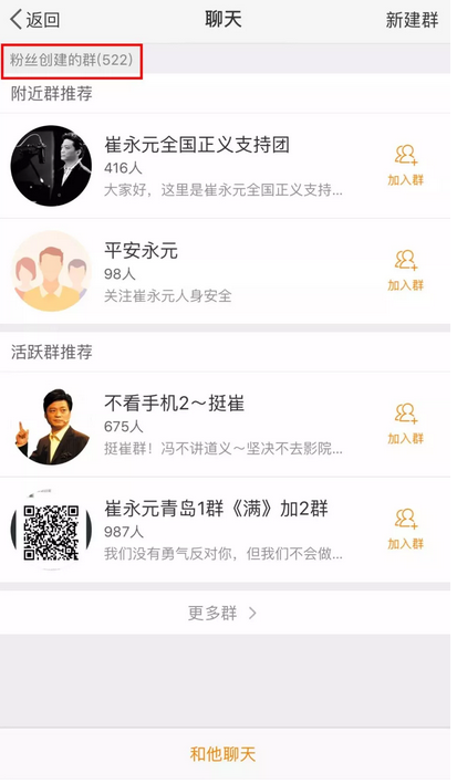 另壹個戰場——崔永元各個粉絲群,也燃燒了起來。崔永元的實名微博已有近1500余萬粉絲,在微博上與他名字相關的粉絲群有522個。