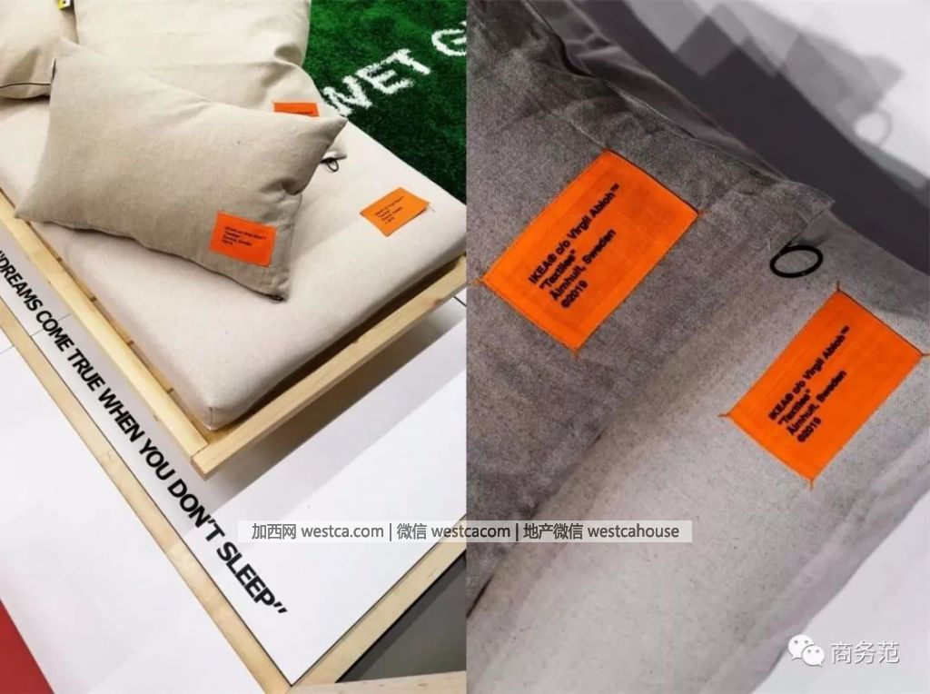 再比如重新設計的抱枕,依舊是普通的純色冷淡系,但配上Virgil Abloh的經典橘色水洗標和黑色文字後,是不是又覺得突然潮了起來?