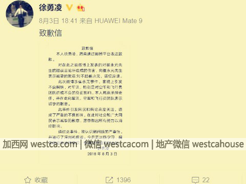 北京時間8月3日,中共空軍前試飛員徐勇凌在微博發布致歉信,向崔永元、中共空軍和中國網民致歉。這封8月3日18時41分發布的致歉信寫到,就之前的錯誤言論向崔永元道歉:對不起崔永元,請您原諒。徐勇凌還就崔永元事件對中共空軍產生的負面影響向其和試飛團隊表達歉意。他還向中國網民致歉。