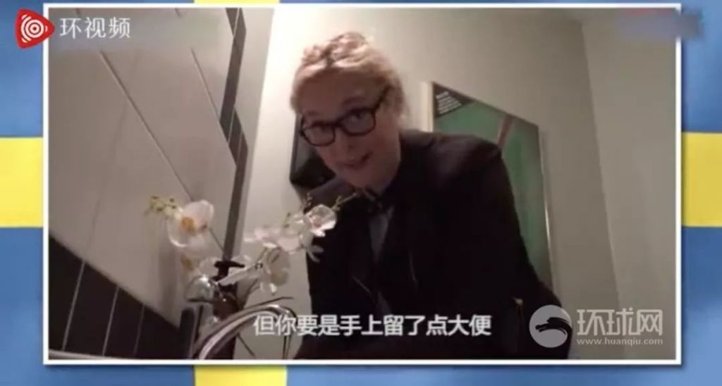 在瑞典,我們就洗手(暗示中國人上廁所用手擦屁股,並不洗手)