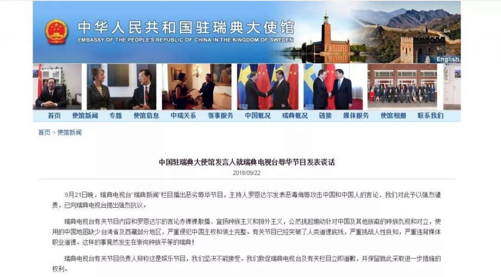 而中國駐瑞典大使館更予以強烈譴責,並向瑞典電視台提出強烈抗議,敦促瑞典電視台及相關節目立即道歉。