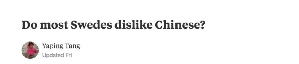 "是的,大部分瑞典人不喜歡中國人,即便其中大多數人根本不了解中國,他們從沒去過、也不打算去中國。