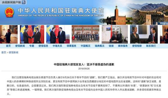 中國駐瑞典大使館發言人9月26日表示:我們注意到瑞典電視台娛樂頻道節目負責人赫爾9月26日關於辱華節目的“道歉”。我們要嚴正指出,赫爾並沒有就節目中針對中國的攻擊和對中國人的赤裸裸的種族歧視作出深刻反省,更沒有就節目中使用缺少台灣省及西藏部分地區的中國地圖作出反省道歉。這樣的“道歉”缺乏誠意,是敷衍的,也是虛偽的,企圖蒙混過關。我們再次強烈敦促瑞典電視台及有關節目組不要再狡辯了,不要再以所謂的“本意”、“表意缺失”和“文化差異”等借口來遮遮掩掩,壹錯再錯。我們再次強烈敦促瑞典電視台及有關節目組向全體中國人民和華僑華人作出真誠道歉,並承諾徹底摒棄種族主義。