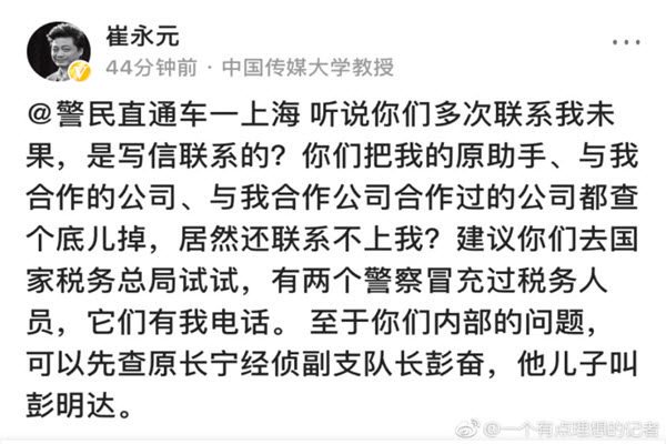 誰知崔永元對上海公安的回應並不買賬。他認為,自己的助理、自己的公司和合作的公司都被公安嚴查,怎麼可能不知道他的電話?他同時強調,查公安內部問題,可以先查“彭奮、彭明達”。