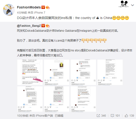 而在這之後,DG的設計師Stefano Gabbana在Instagram和網友的對話曝光,直接發表辱華言論,引起軒然大波。