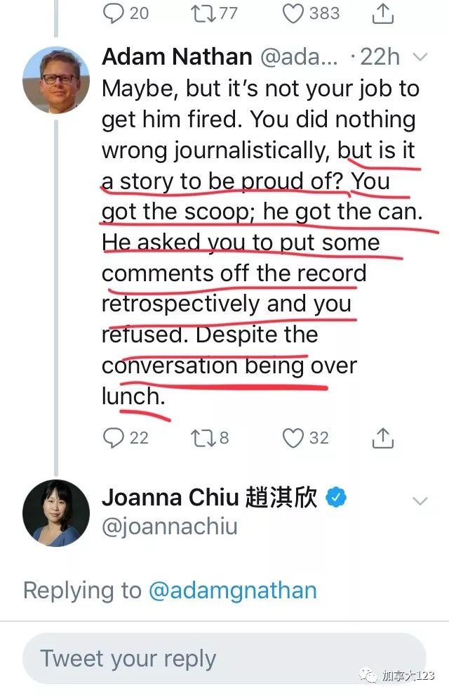 壹個署名Adam Nathan的推友在趙淇欣的推文下留言:“雖然你沒有寫錯新聞,但這是壹個值得驕傲的故事嗎?你得到了獨家新聞,他卻被解雇。他要求你只當作私下談話,不要報道,你拒絕了。並且談話正在午餐時間。”