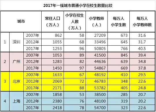 没有提供足够的学位,当然也就没有必要配备足够数量的教师。因此2017年深圳每万人中的专职小学教师人数达到40.5人,广州也有37.8人;而北京剧烈下降到24.8人,上海只有22.6人。按这样的比例来说,广深大概可以做到每个适龄儿童都能入学,而北上大概有一半的适龄儿童,只能黯然回乡,作为留守儿童,孤独求学。