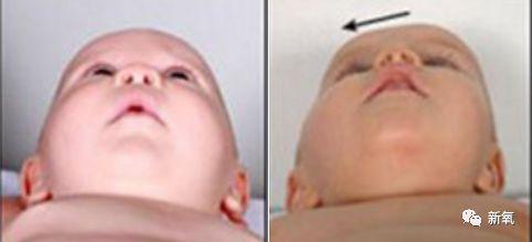 從正面看下圖右側的寶寶,右半邊臉所有的眶骨、顴骨、鼻基底、嘴角、下頜骨全部都低於左邊。(真的有小寶寶這種程度,就需要及時求醫進行矯正了噢)