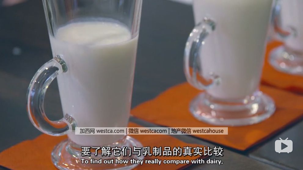 接下来,节目探讨的问题是:牛奶好?还是椰汁、杏仁露一类的植物饮料好?