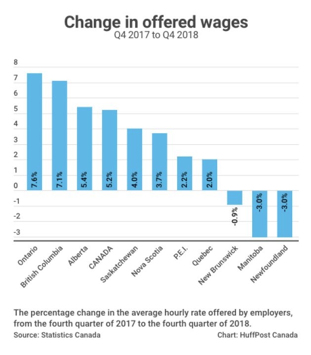也許更值得注意、也更有意義的是,人手短缺迫使加拿大的雇主為員工提高工資。
