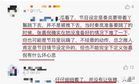 但被反駁了,節目裡明明設置的是讓秦嵐自己跳,張嘉倪或許是演嗨了所以推了秦嵐壹把,不能說她有壞心眼但非得說這是節目安排的,也有點強行洗了。