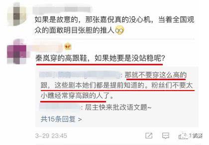 有粉絲澄清稱這個橋段是重演《梅花烙》劇情,不是張嘉倪臨時加戲,推人的動作也沒啥危險的,秦嵐壹個穿慣了高跟鞋的女明星被推壹下不要緊,真要是摔了也只能怪她自己幹嘛非得穿高跟(??)。