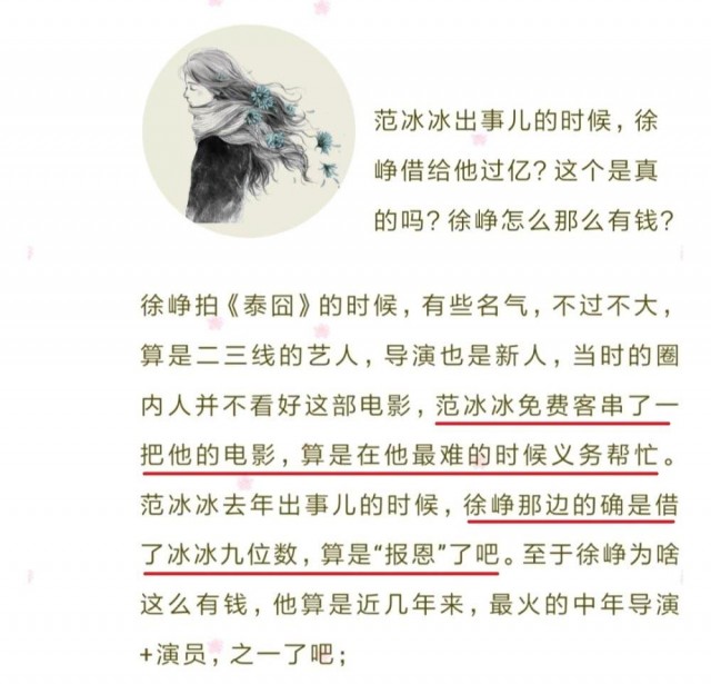 近日,有圈內人在網上曝料稱,其實范冰冰早已經解決了去年的風波,走出了陰霾。而幫她度過難關的正是圈內的好友,其中徐崢更是借給了范冰冰9位數,達壹個億。這幾年,徐崢無論是當演員還是做導演,但凡有他參與的電影,無壹不是高票房、高口碑,而當初他剛剛開始嘗試做導演的時候,正是范冰冰友情客串幫忙,所以爆料人也表示徐崢也是為了償還壹個人情。