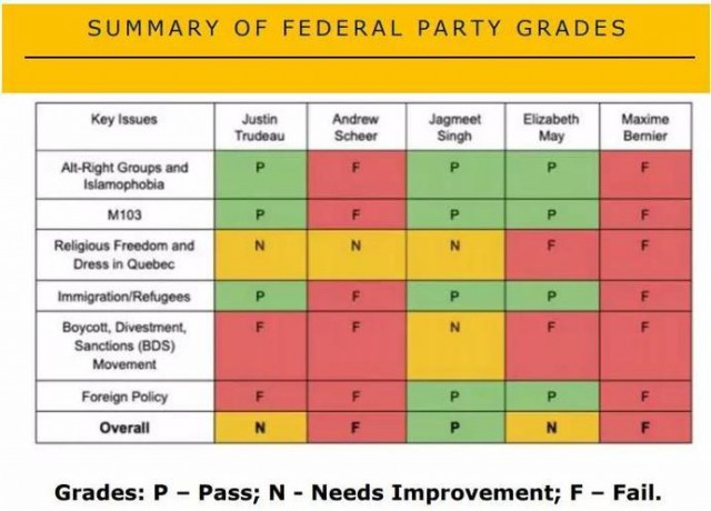 总括部分用图表的形式总结出各党领在“关键问题”上的表现和总分。横栏是党领名字,纵栏是关键问题,包括:极端右翼和伊斯兰恐惧症;M103;宗教自由和魁省的相关着装规定;移民/难民;对以色列的抵制运动;对外政策;总分。P表示合格,F表示不合格,N表示尚可、有待更多努力。