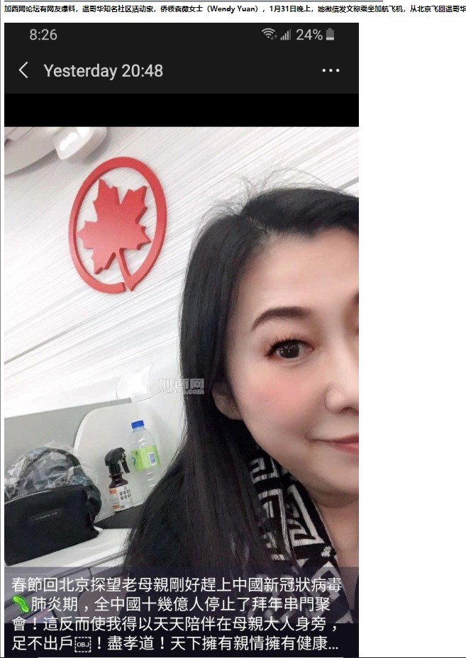 昨天有網友論壇爆料稱有大溫社區知名人士不戴口罩從疫區飛回溫哥華。