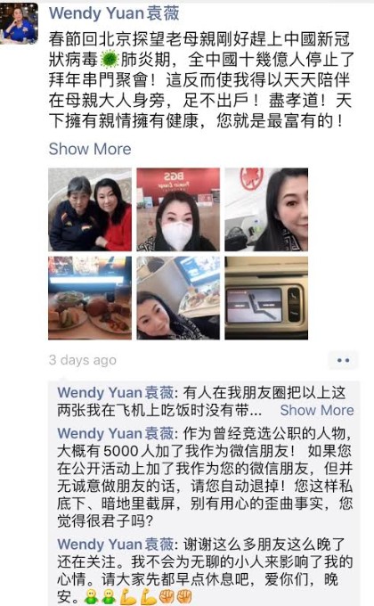 袁薇女士自己在朋友圈已經說明:她全程都戴口罩,吃飯時才會摘下。