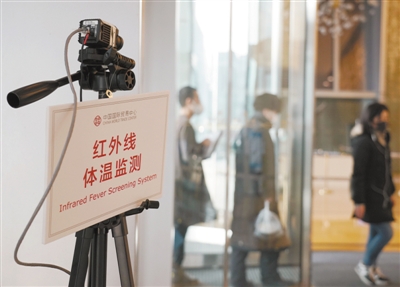 2月12日,中国国际贸易中心第三期通过红外线对进入人员进行体温检测。 新华社记者 张晨霖摄