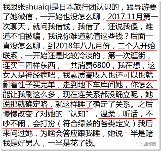 我们把这个事情分段说一下,原文比较长,我们根据剧情发展给分了几段,几乎每段都是槽点满满,实在是……第一段,两个人刚一见面,男方就给女方花了6800元……