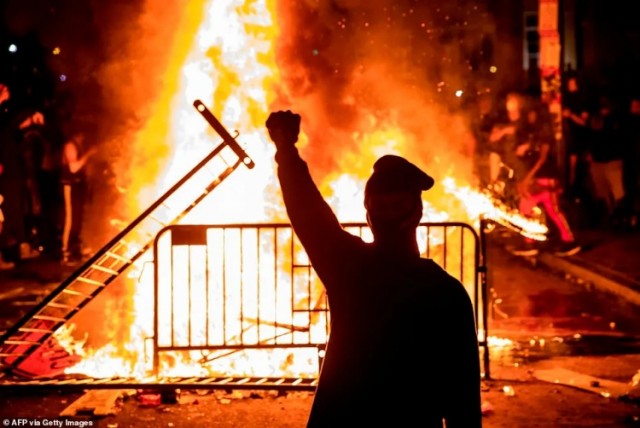 華盛頓DC,抗議者們在白宮外圍點燃熊熊大火,焚燒美國國旗。警察不斷向示威人群發射催淚瓦斯,對白宮嚴防死守。