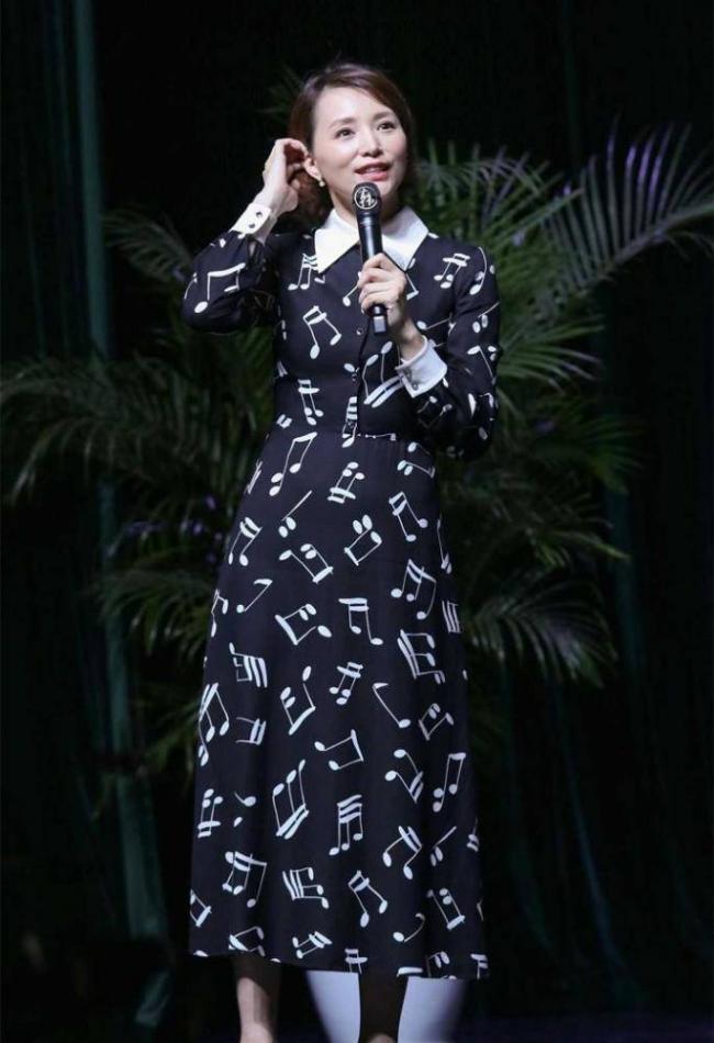 除了刺繡連衣裙以外,印花連衣裙也同樣具備吸睛屬性,但對比色彩艷麗的印花而言,由黑白圖案組成的裙裝單品更適合大齡女性,顏色簡潔、視覺上又有鮮明的對比,完全不用擔心圖案過於繁重而帶來花哨突兀感,兼具實穿性與時髦感。董卿身穿的這款連衣裙就運用了白色音符印花點綴於黑色裙身上,結合襯衫裙的款式設計,簡約又吸睛,即便是通勤場合也能穿。